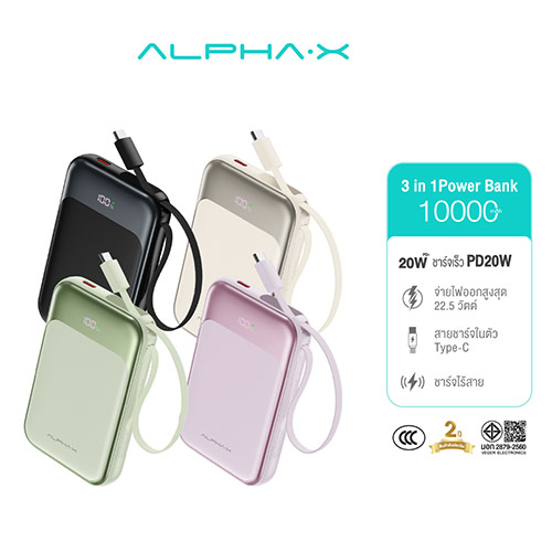 ALP10-28PD PRO | 10,000mAh — 1,090 บาท มาพร้อม 2 สายในตัว (USB-C/Lightning) + พอร์ต USB-C ใช้งานชาร์จได้หลากหลายสูงถึง 3 อุปกรณ์ PD 20W ชาร์จเร็ว iPhone/Android, หน้าจอดิจิทัลบอก % แบตแม่นยำ น้ำหนักพกพาง่าย ดีไซน์ “กล้องจิ๋ว” มีหูหิ้วคล้องมือ ที่เป็นสายชาร์จในตัวที่ออกแบบมาให้เป็นสายคล้องได้ด้วย พกไว้เป็นพร็อพถ่ายรูปเก๋ๆ ก็เลิศ เหมาะกับ: ผู้ใช้สามาร์ทโฟน หรือ iPhone ที่อยากได้แบบ “เสียบแล้วชาร์จทันที” ไม่ต้องพกสาย รับประกัน 2 ปี